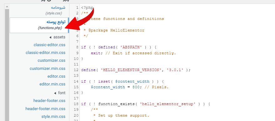 ابتدا وارد قسمت پیشخوان > نمایش > ویرایش پرونده پوسته شوید و روی functions.php کلیک کنید .